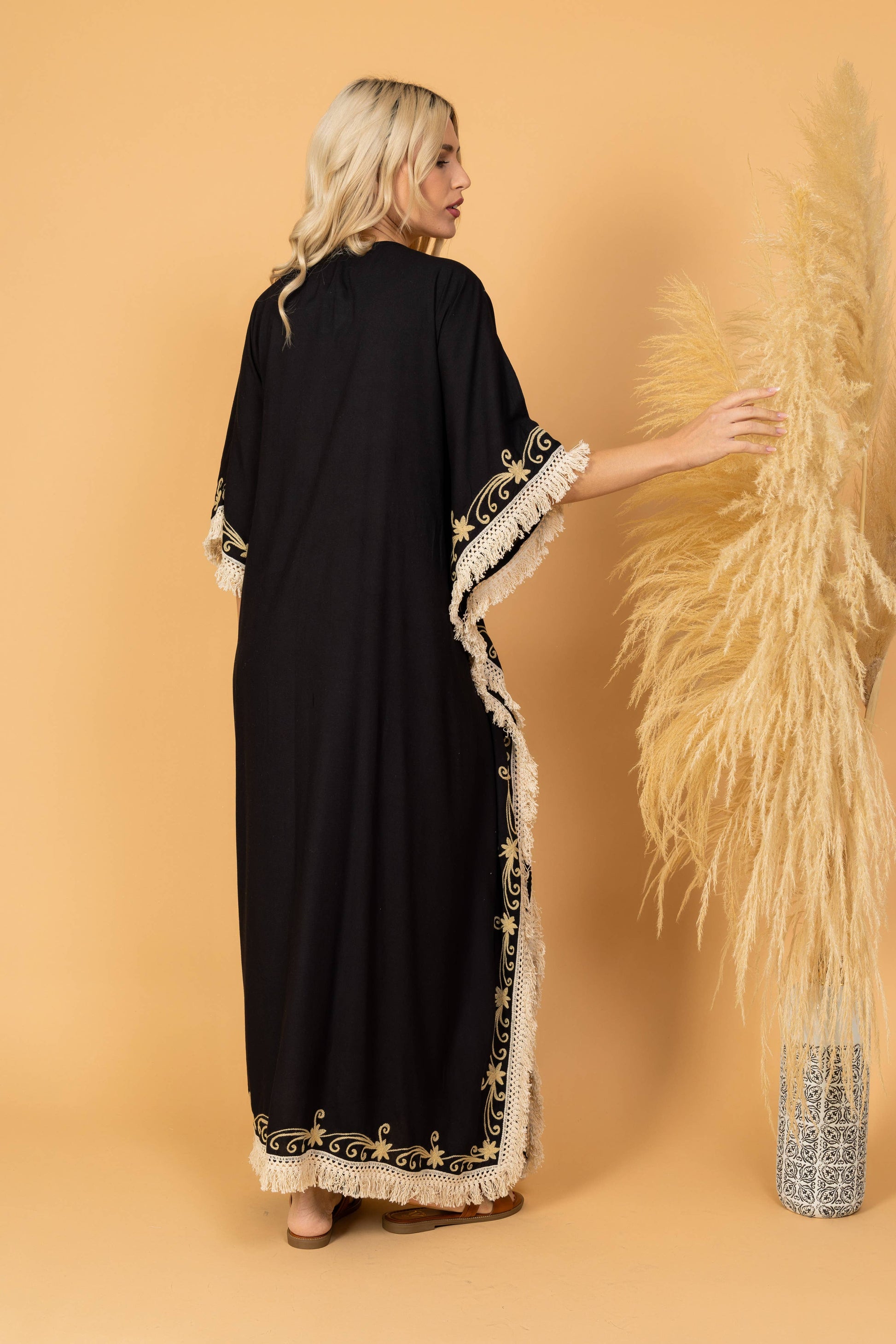 An impressive black cotton kimono with intricate embroidery and piping detail running the entire length. A statement piece with timeless craftsmanship and modern elegance.