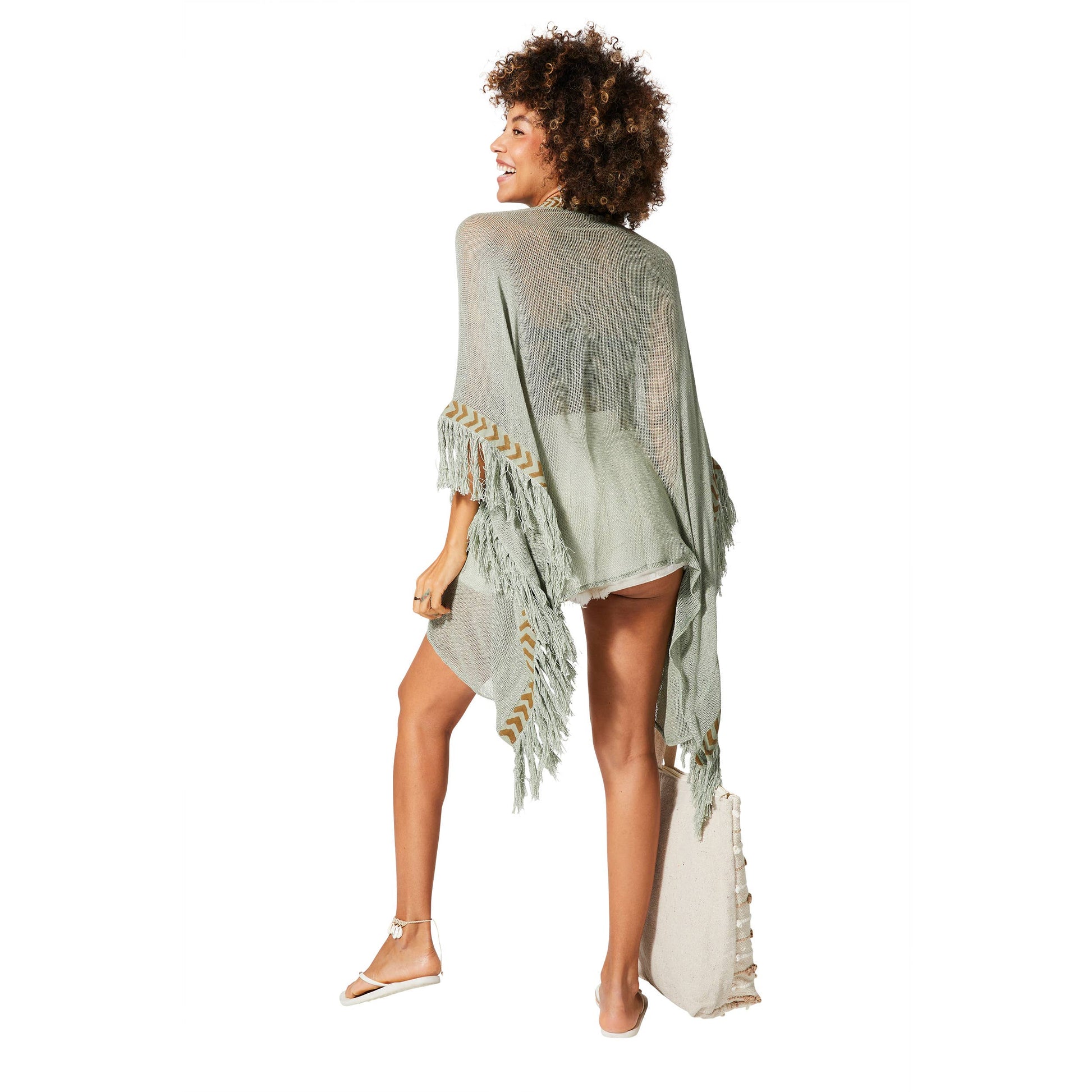 3/4 sleeve short summer kimono. Material: 100% COTTON. Construction: woven Washing: washing machine 30°C. Color (s): green sleeves: 3/4 sleeves, wide, with fringes. FR size correspondence: UNIQUE (36/46).